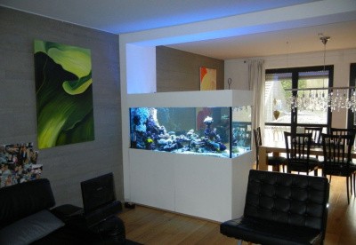 Обслуживание аквариума так или иначе связано с попаданием воды на пол. Как бы аккуратно Вы не чистили его стенки, сифонили грунт, делали подмены воды, избежать намокания пола невозможно. В итоге, очень быстро ламинат в непосредственной близости от аквариума начинает вздыбливаться на стыках, нарушается его декоративный слой, теряется эстетическая привлекательность. Такой ламинат подлежит замене, но как это сделать если у Вас дома стоит аквариум от 500 литров или тонник? Рыбий дом такого объёма трудно сдвинуть с места даже пустой, движение же подобных аквариумов даже слитыми на 2/3 – исключено. Следовательно – чтобы переложить пол в комнате с подобным аквариум нужен перезапуск. А дело это хлопотное и опасное для здоровья рыб. Разбор и монтаж стенки, так же не способствует продлению срока её службы.