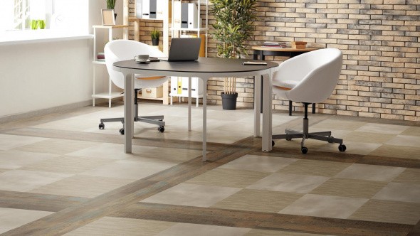 Интересный вид и фактуру имеют кварц-виниловые полы BLUES ROOTS от компании Tarkett. Коллекция позволяет сделать имитацию красивого мозаичного покрытия, используя для этого разные оттенки.