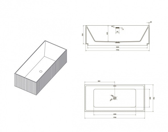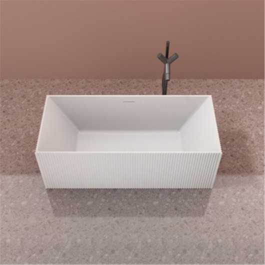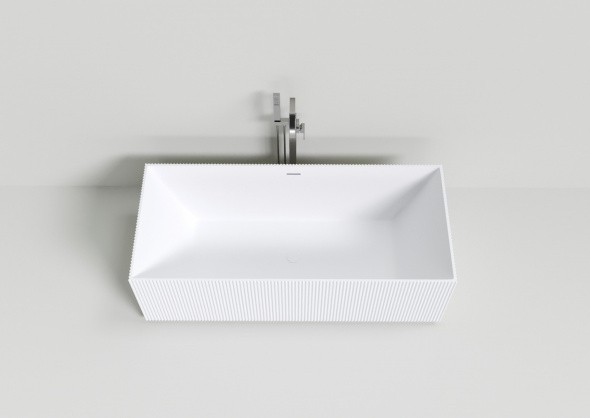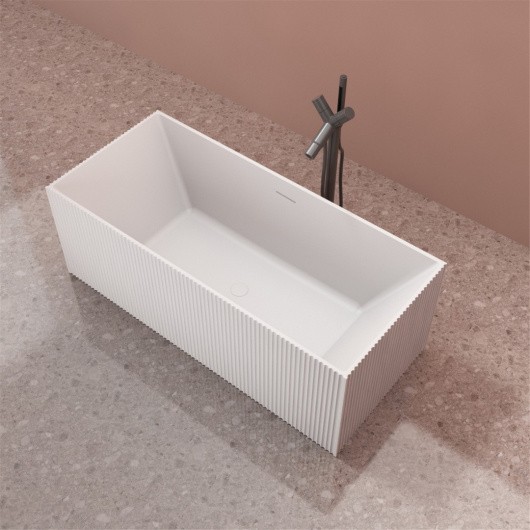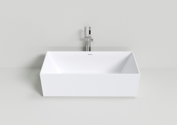 Округлая ванна из искусственного камня белого цвета. Эта ванна имеет длину 170 см. и позволяет принимать водные процедуры как сидя, так и лёжа, добиваясь максимальной релаксации. Расположенный в центре элегантной чаши слив, позволяет рассматривать эту модель как двухместную.